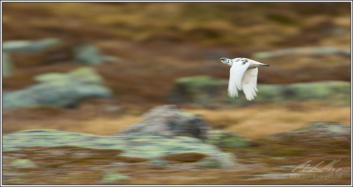 Mlčky usedáme do auta a pokračujeme v našem bezcílném toulání. Dlouhé hodiny projíždíme krajinou a vlastně nevíme, kde jsme. Ocitli jsme se na nějakých skalnatých hřebenech daleko od cesty. Široká údolí skrývají ještě širší jezera, která jsou temná jako opál. Nakonec se však nějaký cíl přeci jen objevuje. Bělokur horský! Nejdřív ovšem jen jako velmi nezřetelná výzva. Lovec v nás se tedy probouzel jen pozvolna. Vlastně jen já jsem šel za 300 metrů vzdáleným pánem místních hor, který seděl na kameni s dokonalým přehledem po celé krajině. Kluci čekali v autě a bez velkého zájmu sledovali mé možná marné počínání. Nejspíš si byli jisti nezdarem celé mé akce. Bělokura jsem naoko bez povšimnutí míjel, jako sob toulající se bezcílně krajinou. Za to on však ze mě nespouštěl oči ani na okamžik. Hlavu si mohl vykroutit, ale zatím pevně seděl. Když jsem se pak dostal až za něj, jeho sněhobílé tělo zmizelo za malým výčnělkem obrovitého kamene, na němž seděl. Ve stejný okamžik se šelmička ve mně už nadobro probudila. Vyrazil jsem na lov. Ani bělokur však nebyl žádný elév. Brzy jsem spatřil jeho hlavičku, která jako periskop vykukuje zpoza kamene. Celkem patová situace, říkám si v duchu. Náhoda mi však téměř okamžitě nabízí pomocnou ruku. Když už bělokur se mnou ztratil trpělivost a rozhodl se přelétnout na jiný kámen, odněkud se vynořil druhý kohoutek a hurá za ním. Honička začala. Ihned mi docvaklo, že právě teď je ten správný čas vydat se za oběma rivaly. Mají právě přeci jen jiné starosti. Nepozorován měním stanoviště. Vybírám si místo s parádním přehledem a brzy fotografuji oba rozvášněné bělostné rytíře. Na letovky je poměrně šero, ale přeci jen zkouším štěstí. Probíhá právě tok a může přijít mnoho zajímavého. Jakoby mě Vláďa slyšel, už to nevydržel a vydal se také na lov. Schoval se za kámen, kde kohoutek seděl prvně, zřejmě s nadějí, že se tam vrátí. Brzy se ale ukazuje, že jsem na lepším místě…